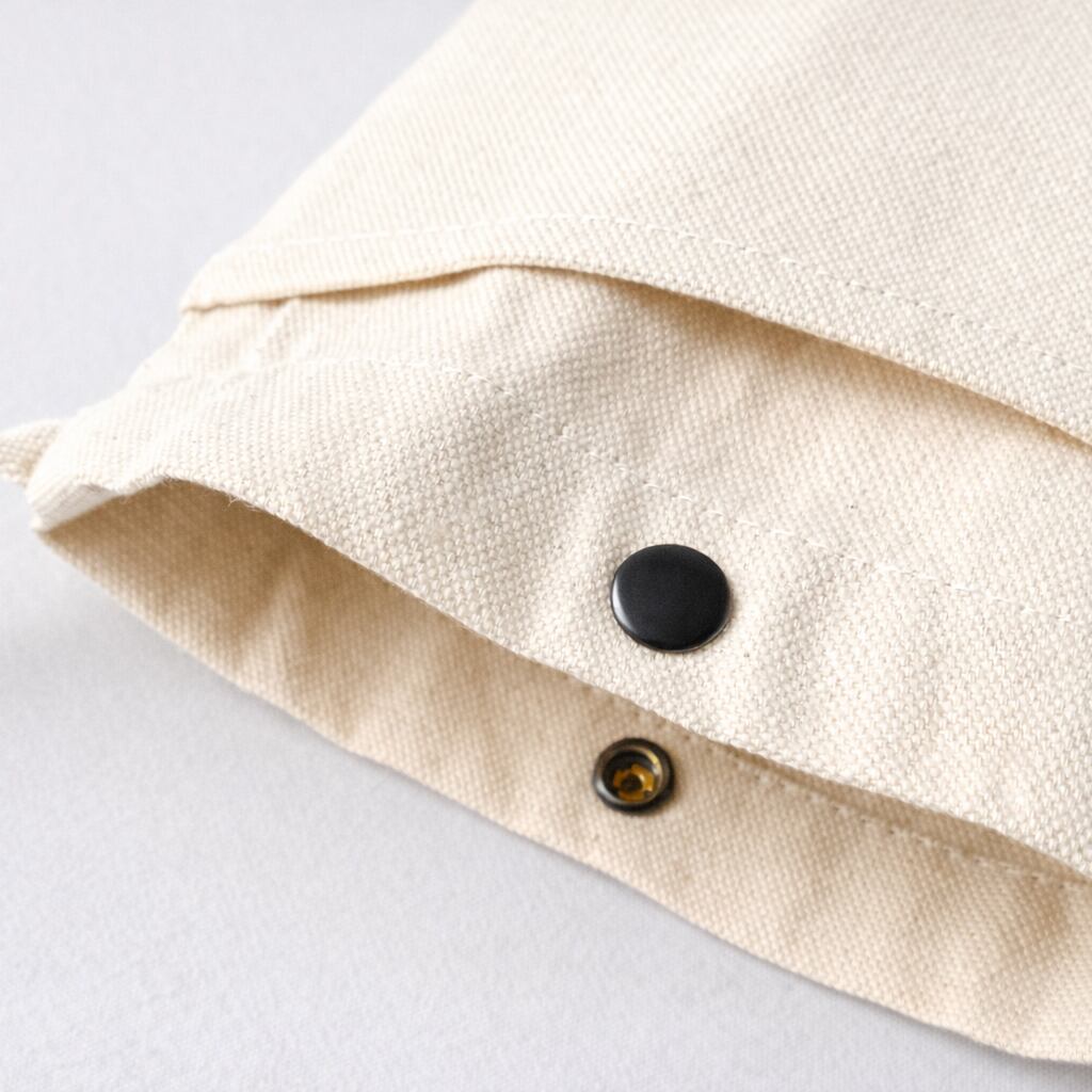 コットン100%のキャンバス生地に、財布、鍵、スマホなどを収納できる丁度良いサイズ感、便利なフロントポケットも付いた機能的ディティール。