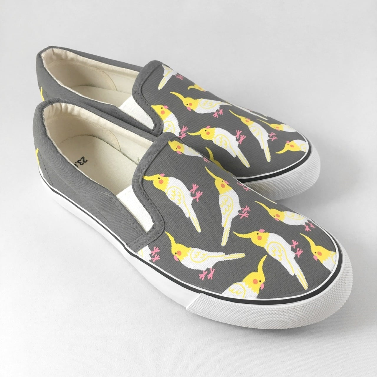 キャンバススリッポンに、手描きで『オカメインコ柄』をペイントした『LACICO(ラシコ)』のオリジナルハンドペイント作品です。