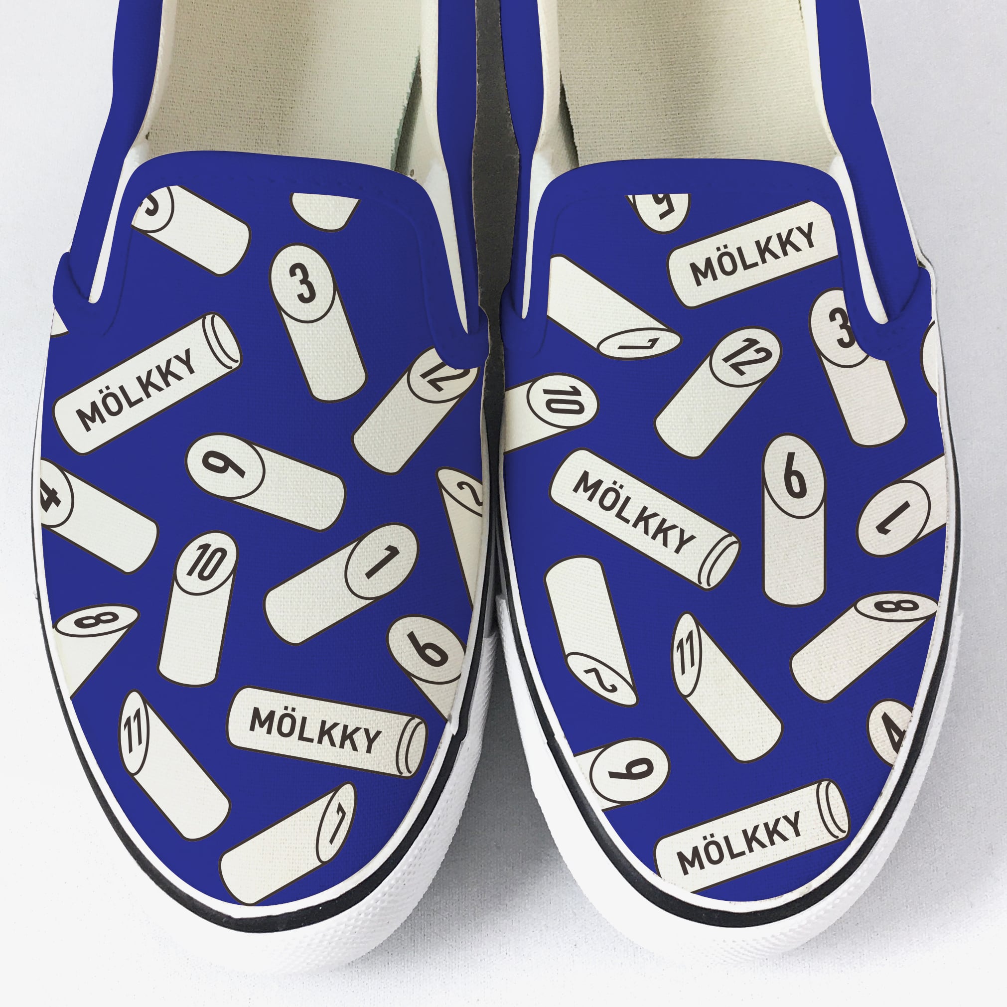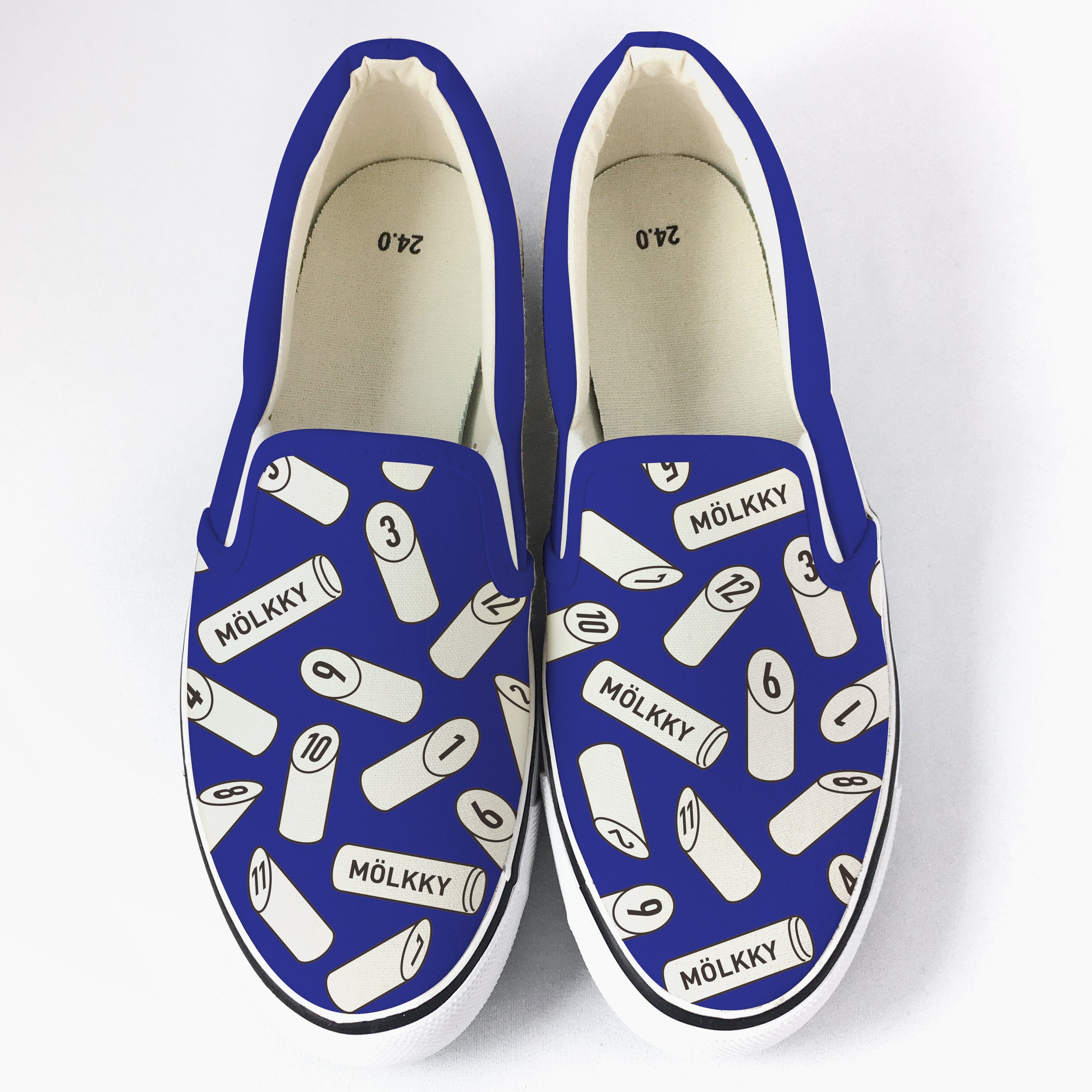フィンランドのスポーツ『Mölkky(モルック)』柄をスリッポンにハンドペイントしたLACICO(ラシコ)のオリジナル作品です。