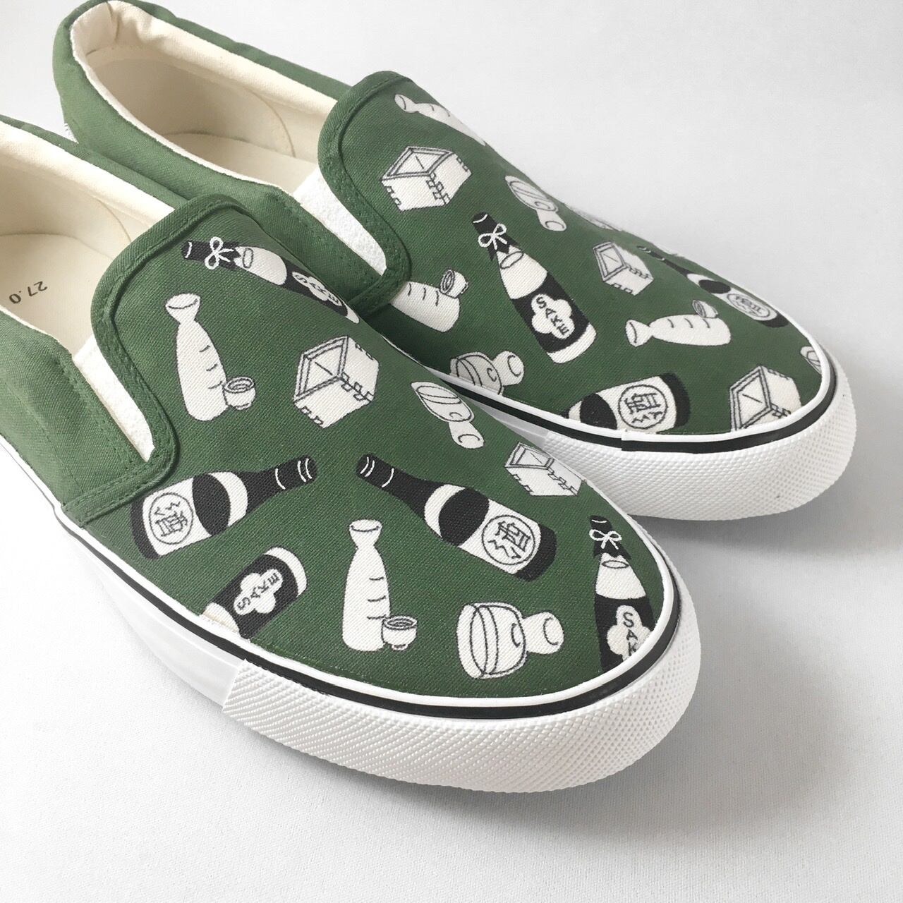 キャンバススリッポンに、手描きで「日本酒柄」をペイントした【LACICO(ラシコ)】のオリジナルハンドペイント作品です。