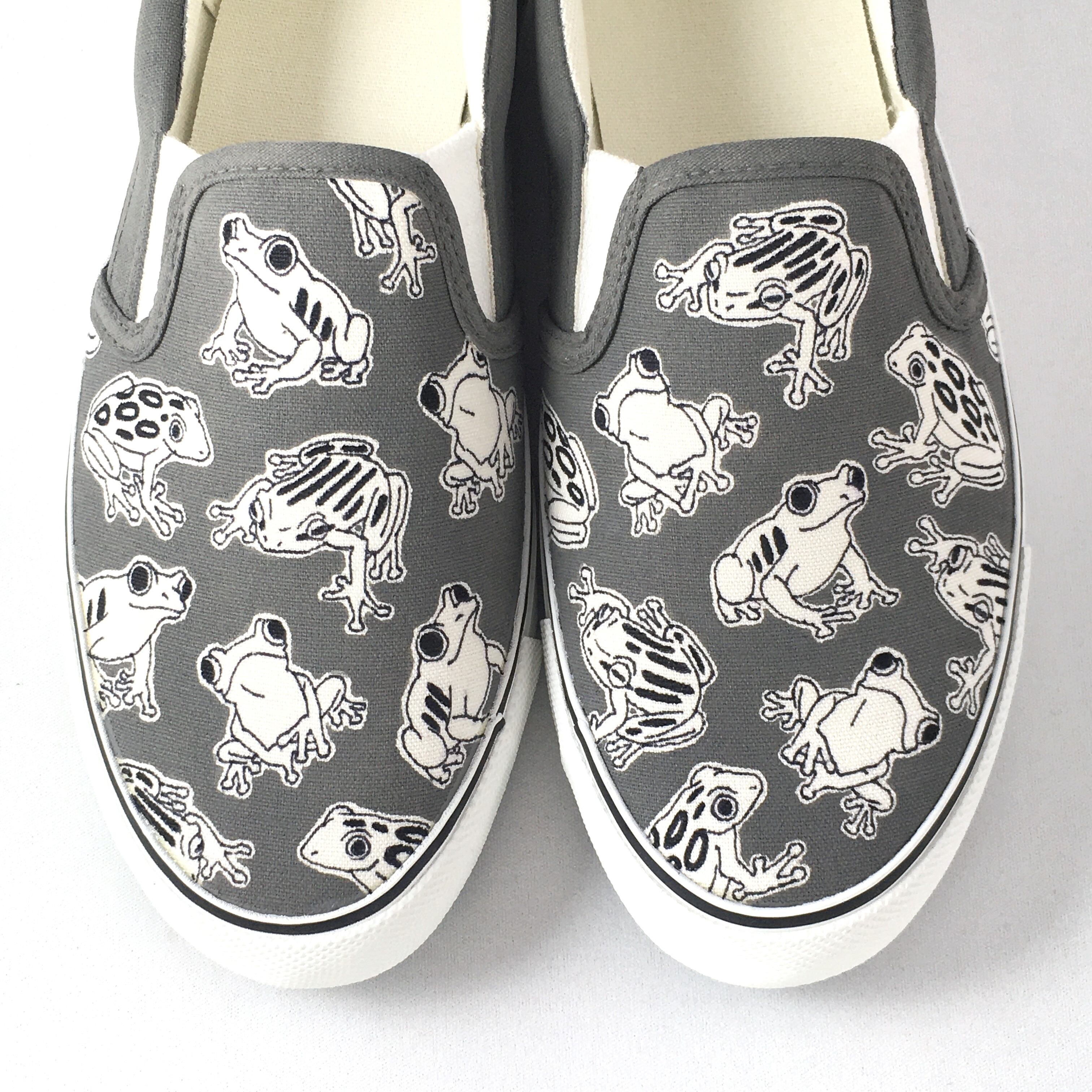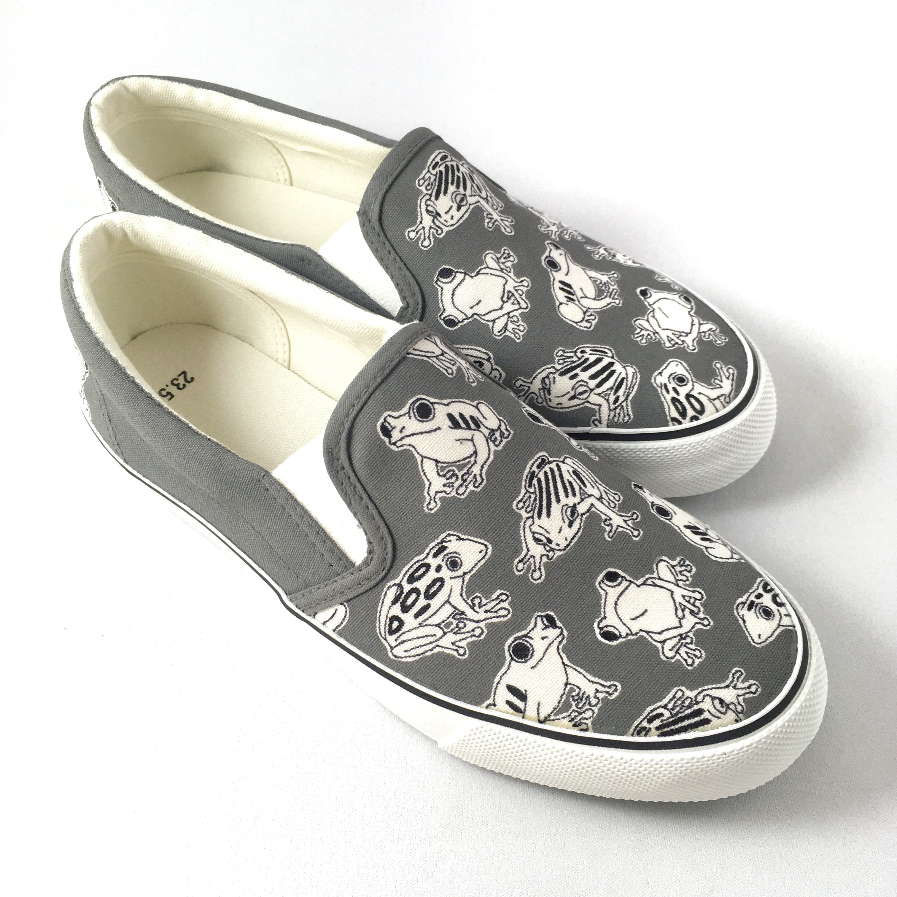 「カエル柄」をスリッポンにハンドペイントした【LACICO(ラシコ)】のオリジナル手描き作品です。
