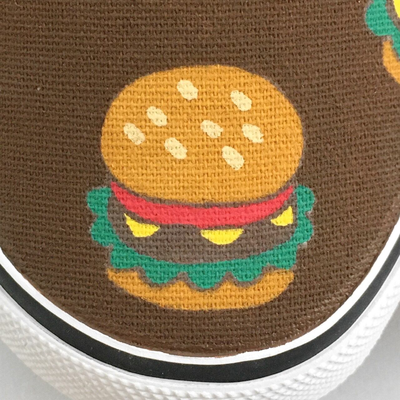キャンバススリッポンに、手描きで『ハンバーガー柄』をペイントしたLACICOオリジナルハンドペイント作品です。